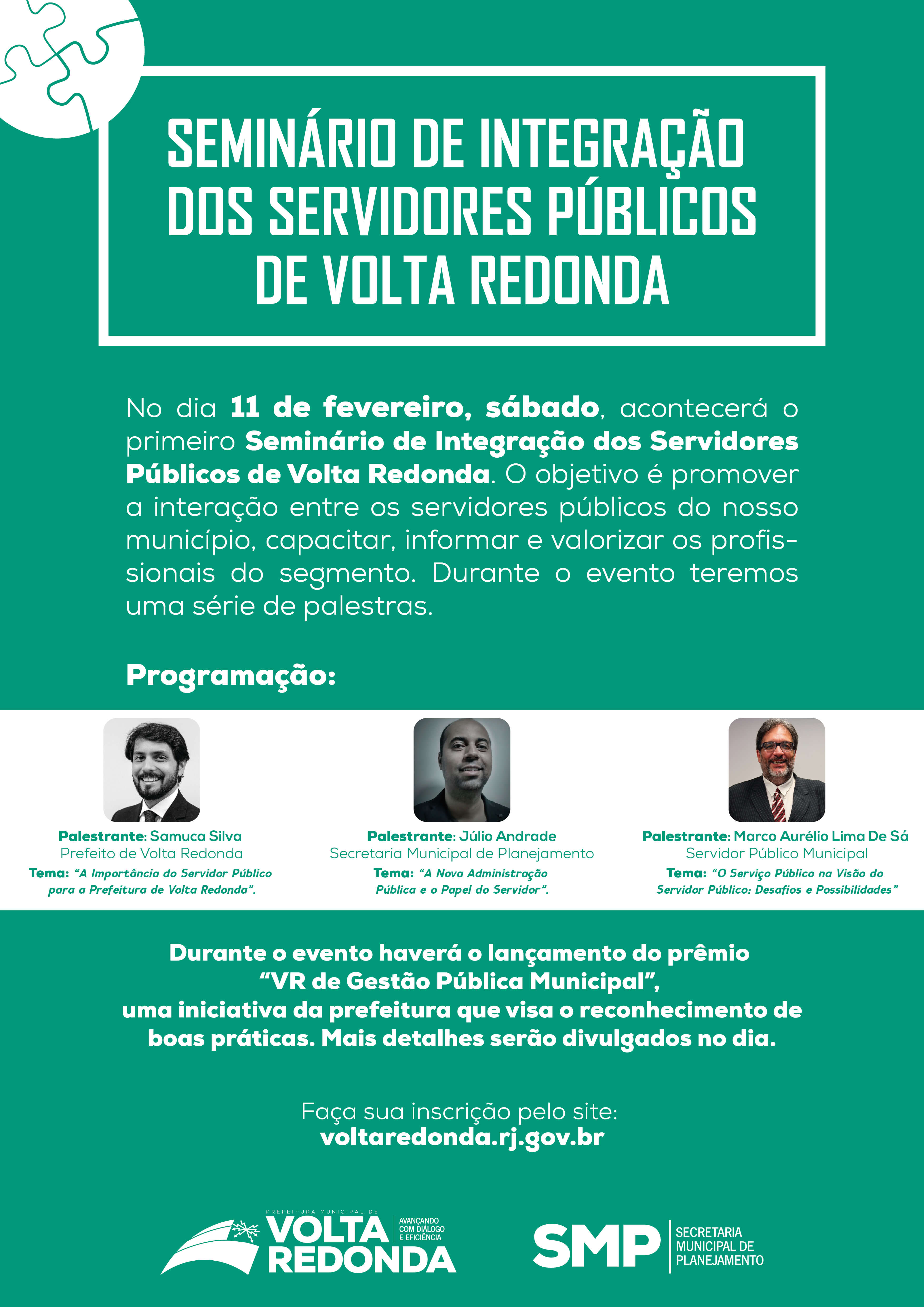 A prefeitura de Volta Redonda promove no segundo sábado de Fevereiro, dia 11, o primeiro Seminário de Integração dos Servidores Públicos de Volta Redonda. O objetivo é promover a interação entre os servidores públicos do município, capacitar, informar e valorizar os profissionais do segmento. Durante o evento haverá o lançamento do prêmio ‘VR de Gestão Pública Municipal’.